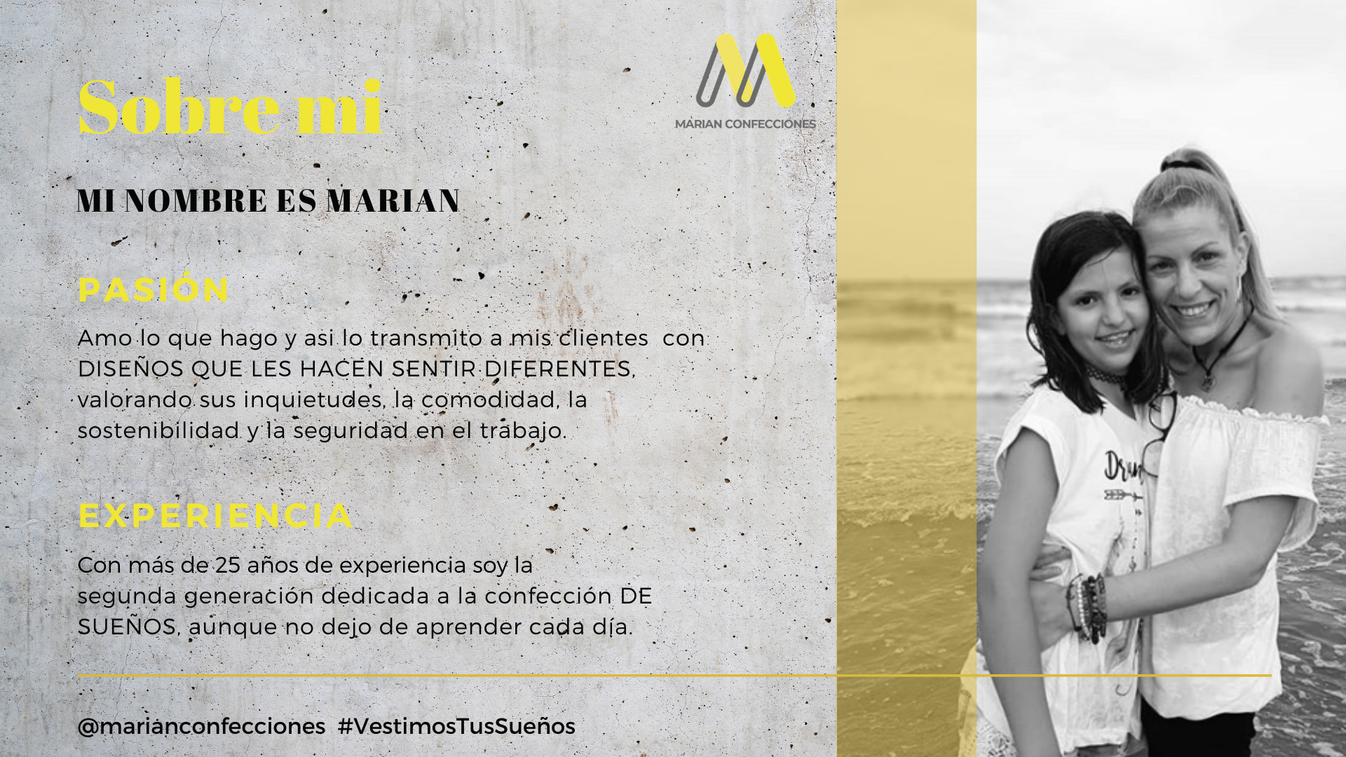 Mi nombre es Marian y amo lo que hago. Así lo transmito a mis clientes. Mi meta es que con mis deseños te sientas diferente. Valoro tus inquietudes, la sostenibilidad y la seguridad en el trabajo.